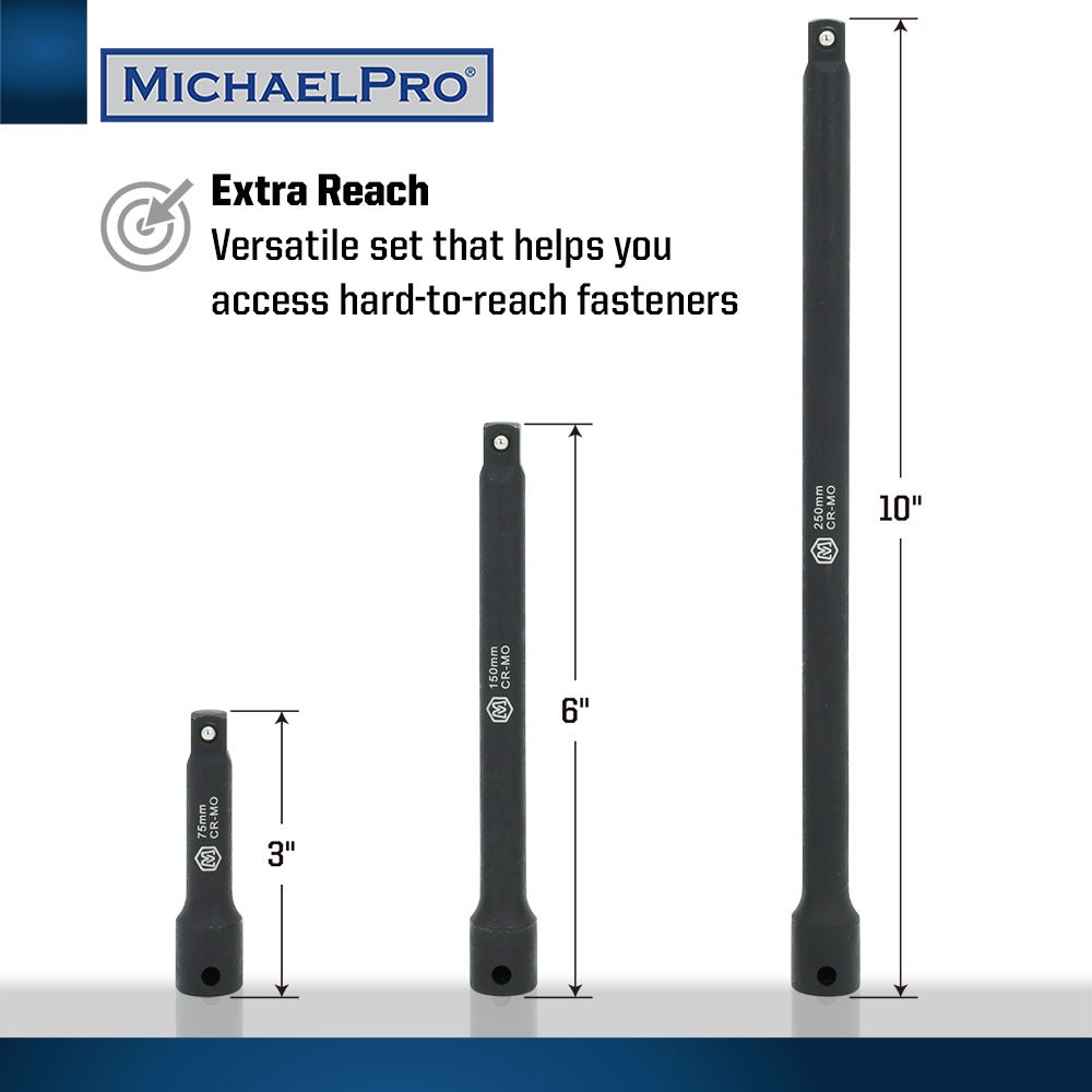 Practical 3/8-Inch drive with lengths 3”, 6” and 10” that gets you covered, making your repair jobs fuss-free.